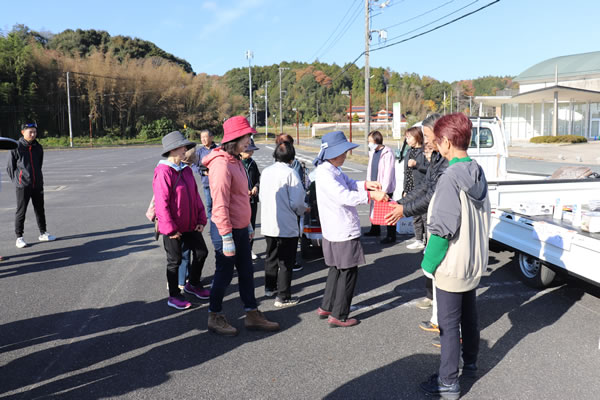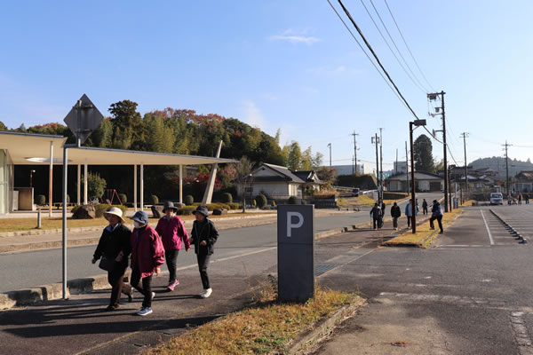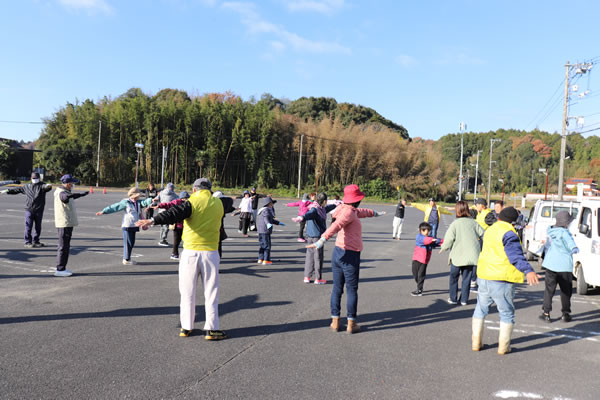 くい文化センター前の駐車場に集まった40名の参加者がしっかりと準備体操して約3kmのコースを親睦を深めながら歩きました。